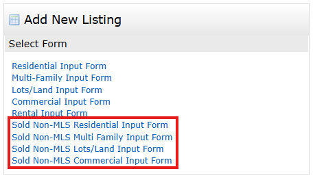 If you represent a buyer on a non-MLS sale, you can submit this listing as a Sold Non-MLS listing after settlement. Sold Non-MLS input forms can be found in the Input tab of Matrix, in the Add New Listing section.